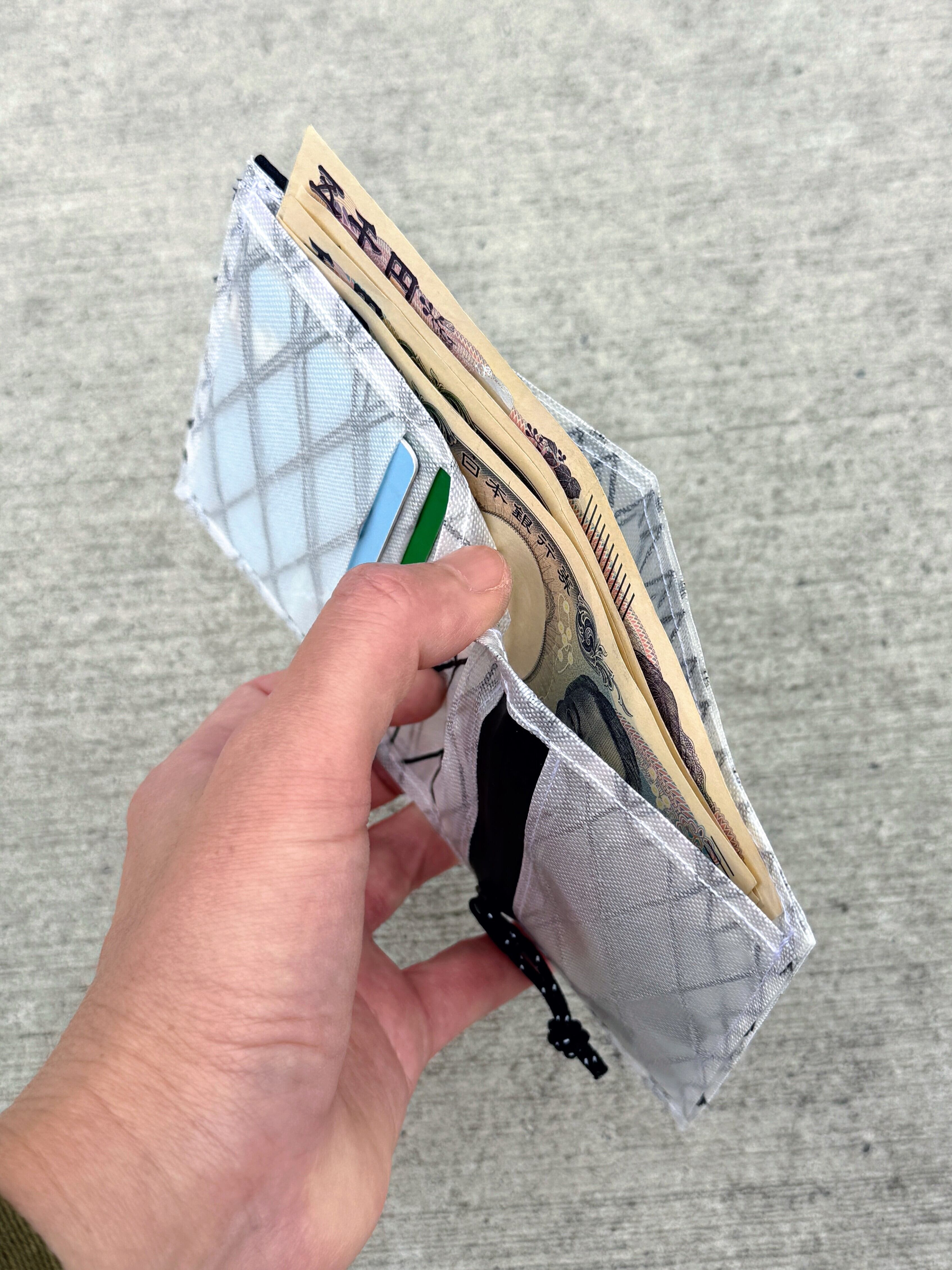 また縫製製作のため完全防水ではありませんが、発汗・小雨程度ならお札を濡らさず携行できることも確認しています。